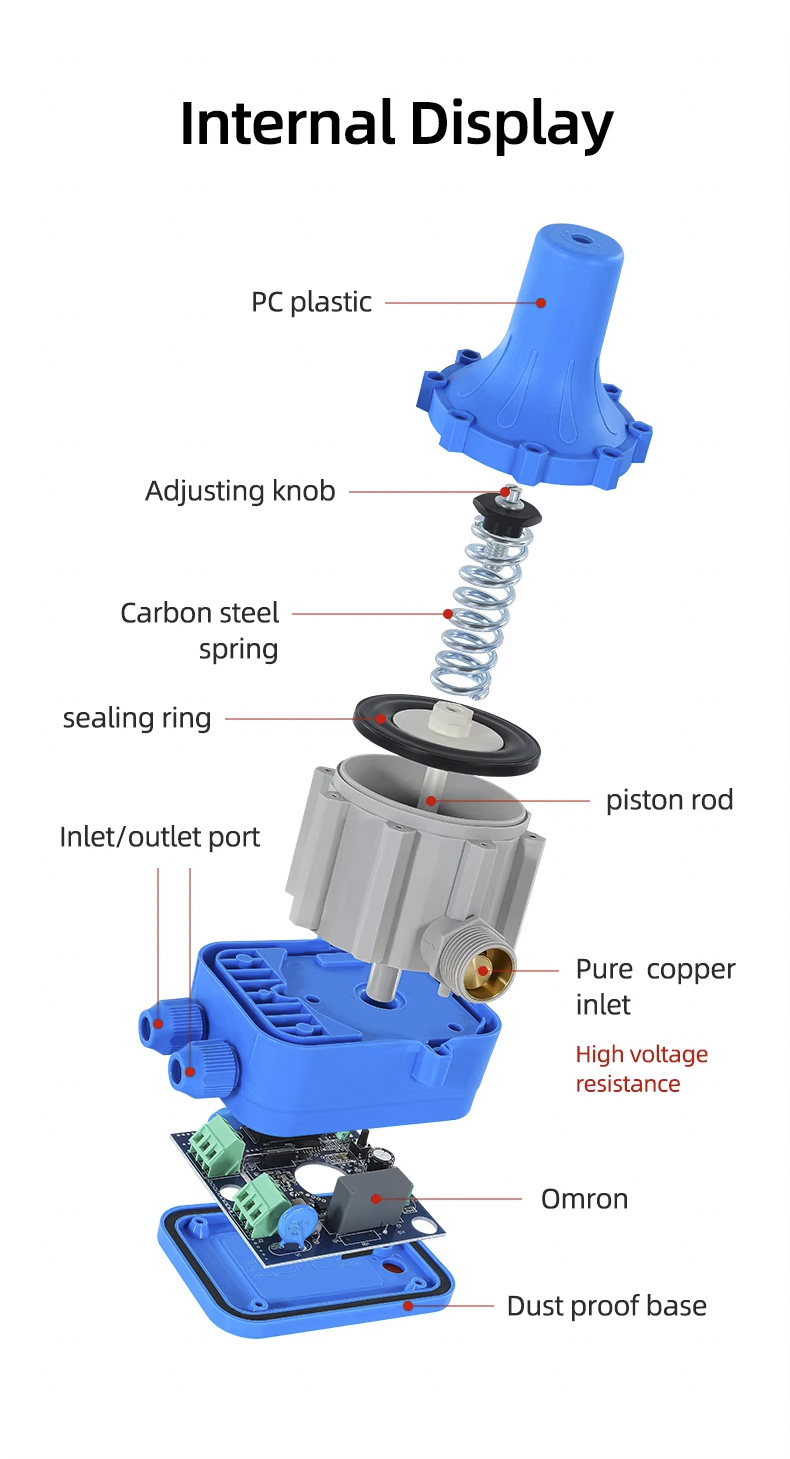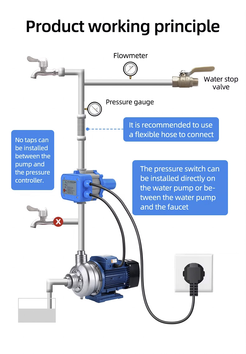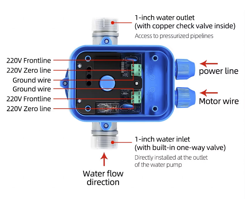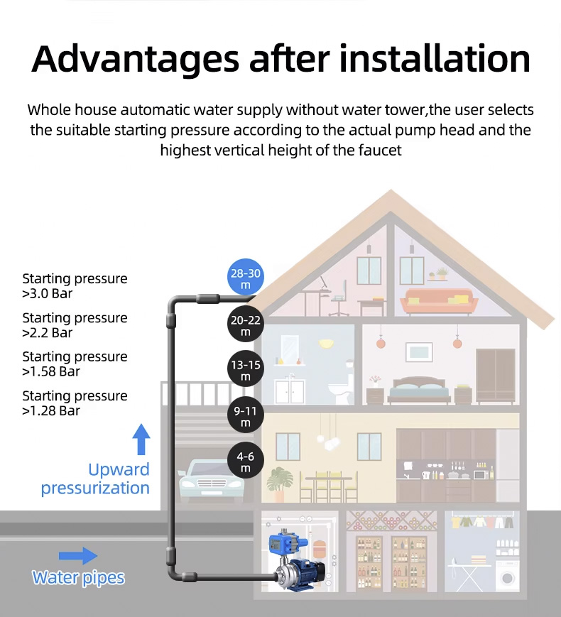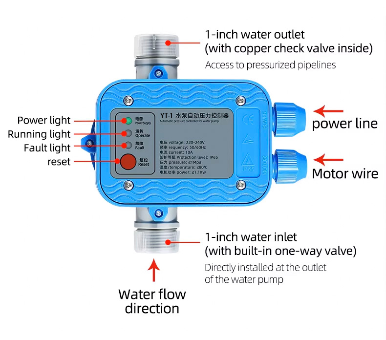 Automatický ovladač čerpadla Elektronický ovladač tlaku vodního čerpadla může nahradit složité instalace automatického vodního čerpadla. Má vlastnosti stabilního výkonu, nízké údržby a dlouhé životnosti.