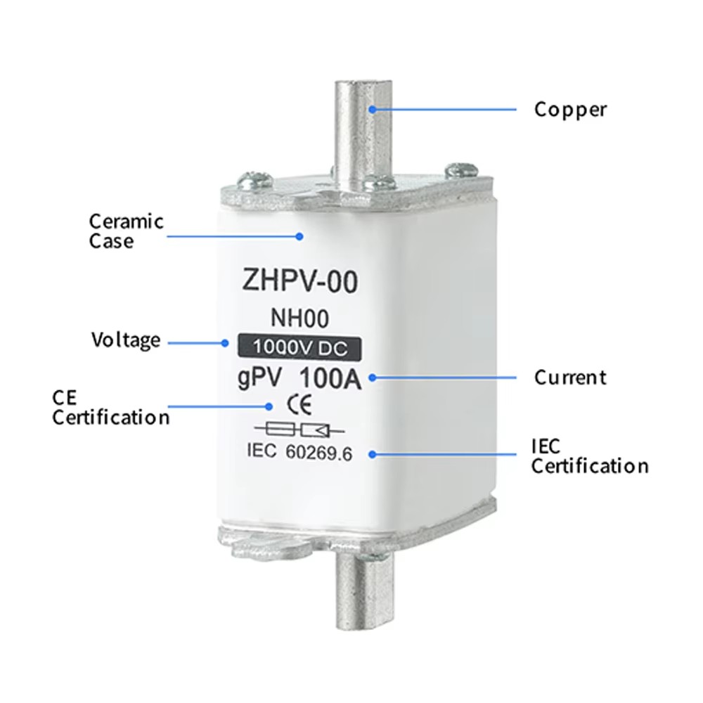 Fotovoltaický systém NH00 DC 1000V 32~100A Pojistkový článek je vhodný pro nadproudovou ochranu ve fotovoltaických DC systémech. Tento produkt podporuje maximální napětí 1000V DC a proudový rozsah 32~100A. Je navržen speciálně pro solární elektrárny a systémy skladování energie a dokáže účinně zabránit poškození zařízení způsobenému přetížením nebo zkratem.