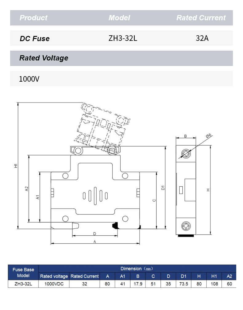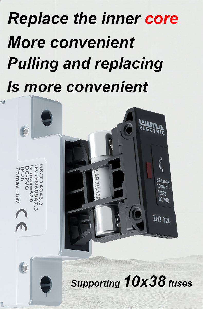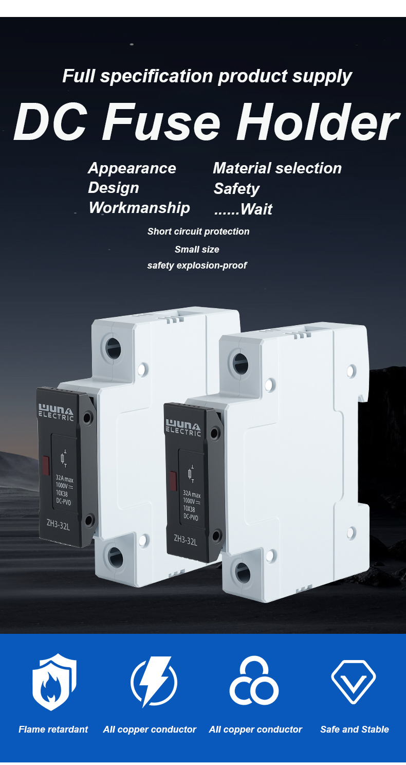 Držák pojistek ZH32L DC 1000V pro fotovoltaické články je speciálně navržen pro použití ve fotovoltaických (PV) systémech, především k ochraně solárních panelů. Stav rozbití solárních panelů spočívá v tom, že při efektivním rozbití vadné sady solárních článků to neovlivní provoz jiných normálně fungujících sad solárních článků. Pojistka ZH32L DC 1000V Fuse Holder dokáže bezpečně ochránit FV modul a jeho vodiče před hrozbou zpětného přetížení, bez ohledu na to, zda je ohroženo stejnosměrné napájení. S rostoucí poptávkou po balíčcích solárních článků s vysokým výkonem na trhu, propagací a rozvojem fotovoltaických systémů a aplikační technologie výroby elektrické energie připojené k větrné energetické síti se stalo použití vysokonapěťových stejnosměrných pojistek k ochraně bezpečného provozu systémů fotovoltaických článků připojených k síti důležitým mezinárodním technickým opatřením.