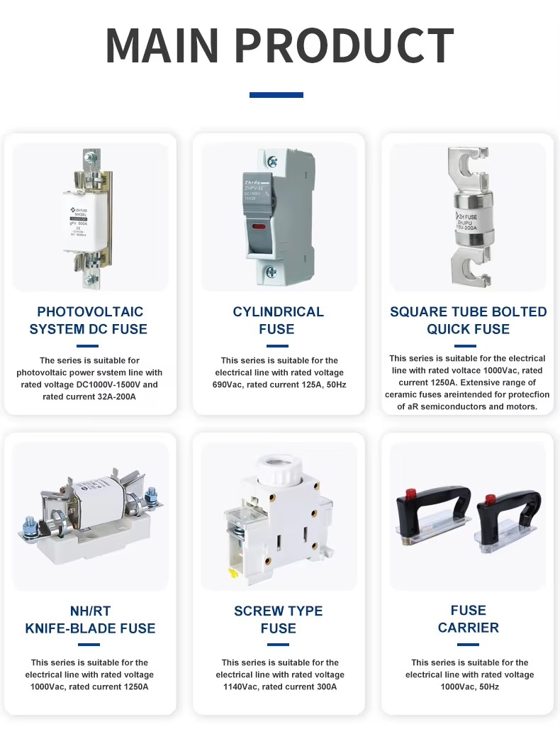 Strukturální charakteristiky ZHPV-125 1000V DC FUSE BASE a pojistkových spojení 22 × 58mm válcovské keramické pojistkové dno ve fotovoltaickém systému jsou následující. Tato série pojistek se skládá z pojistkového spojení a držáku pojistky. Variabilní průřezová pojistková karoserie vyrobená z čistého měděného plechu (nebo měděného drátu, stříbrnýho drátu, stříbrného listu) je utěsněno v pojistkové trubici vyrobené z vysoce pevné keramické nebo epoxidové skleněné látkové trubice, naplněné chemicky ošetřeným vysoce čistým křemenným pískem jako obloukové hasické médium. Dvě strany jádra pojistky jsou spolehlivě spojeny s koncovým desce skrz svařování bodů a vytvářejí strukturu ve tvaru válce. Základna pojistky ZHPV-125 1000V je vyrobena z pryskyřice nebo plastové skořepiny tlačené elektrickým nárazem, včetně pojistkového prvku, který je připojen nýtováním jako podpora komponenty tělesné pojistky v vhodné velikosti. Tato řada pojistek má výhody malého objemu, snadné instalace, bezpečného použití a krásného vzhledu.